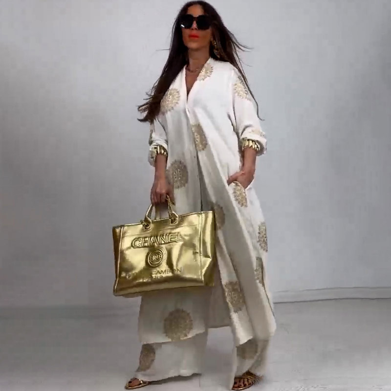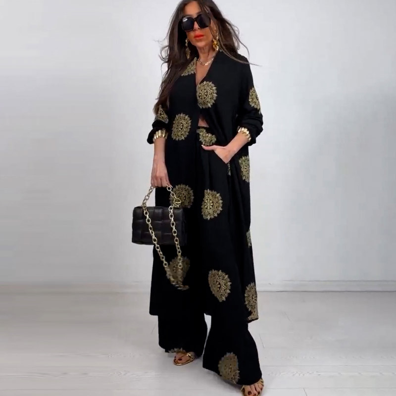 Elegant and sexy V-neck top+printed wide leg pants two-piece set