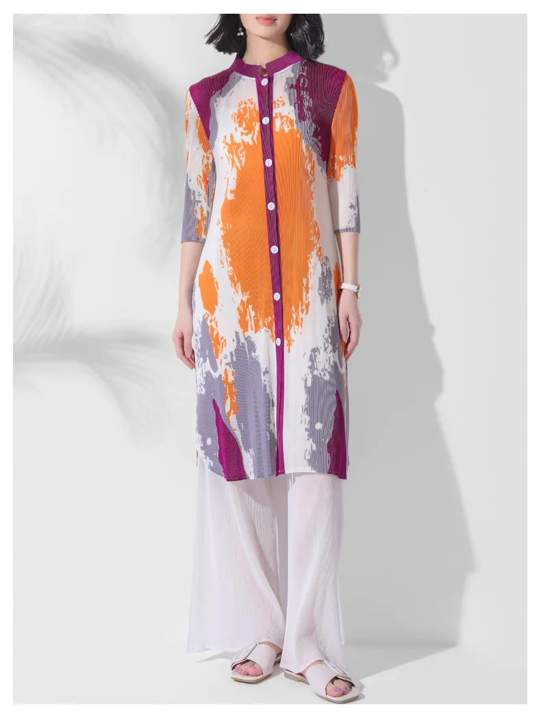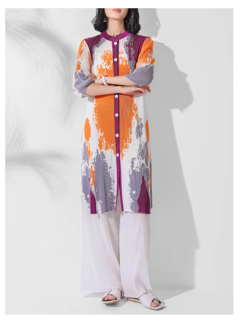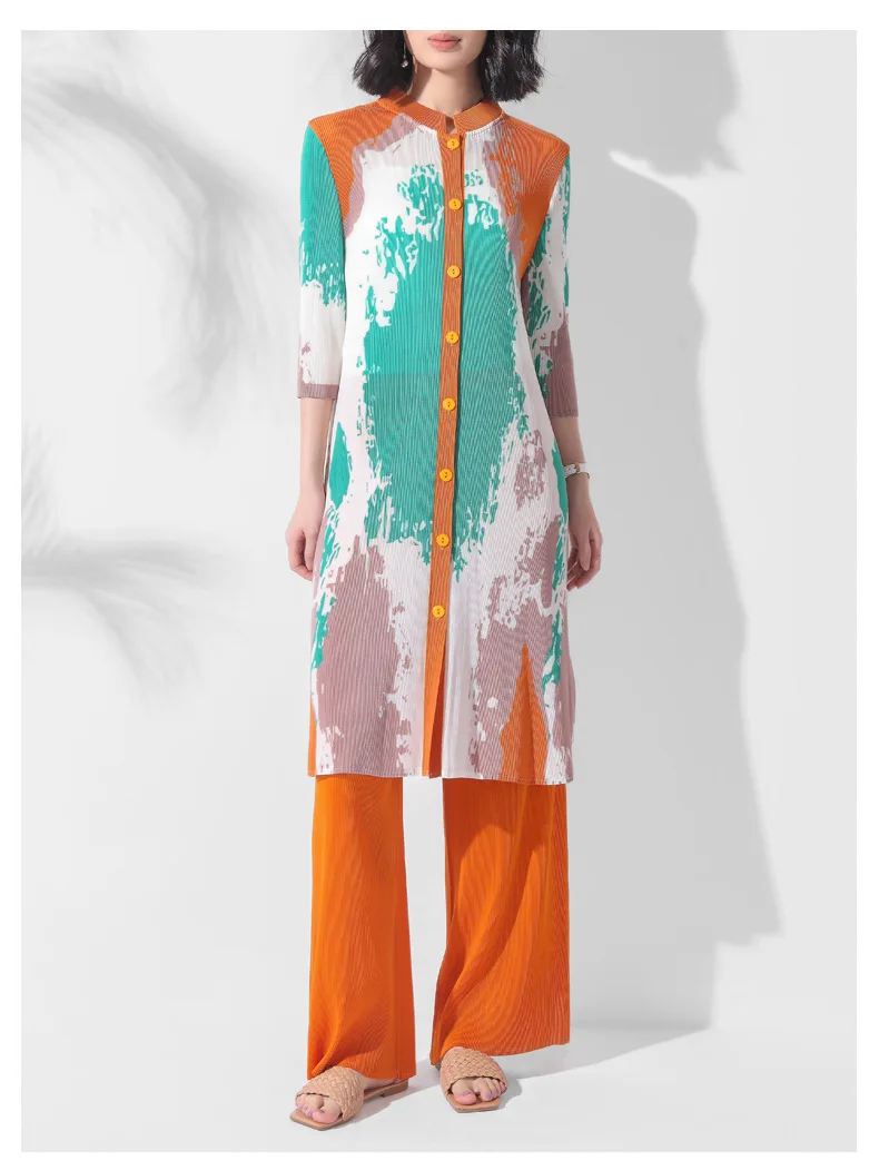 Folded print long jacket pants two-piece set stand collar button top wide leg pants two-piece set