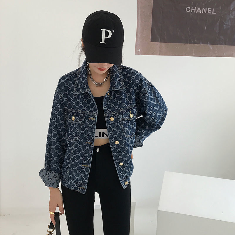 Full printed jacquard long sleeved denim jacket for women early autumn casual top spring and autumn denim jacket