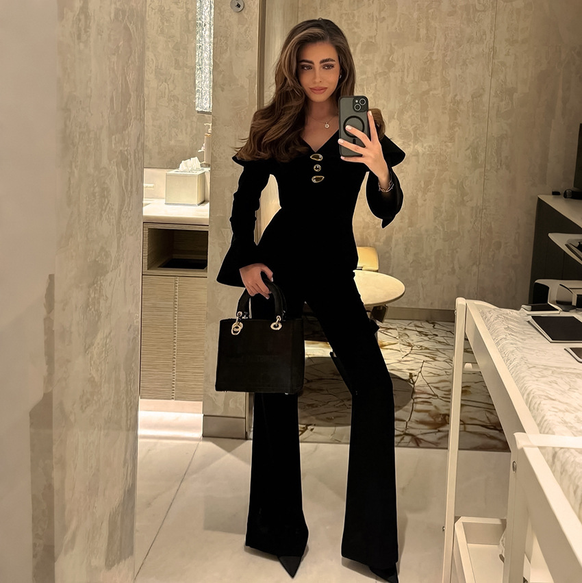 Retro black sexy V-neck slim fit top flared pants elegant set for women