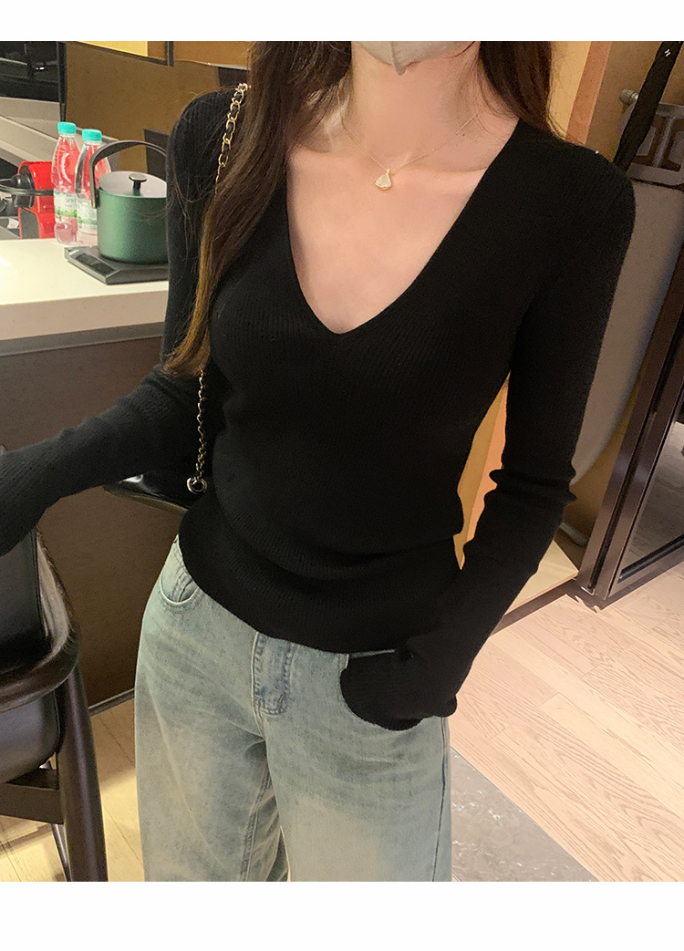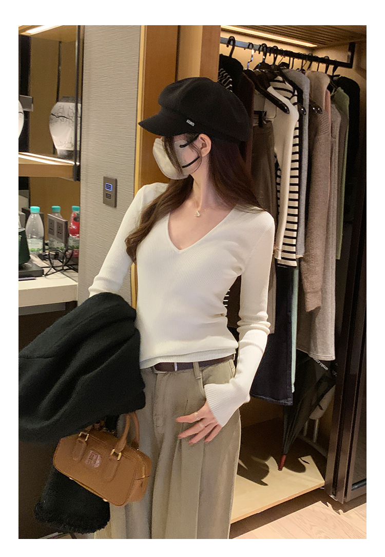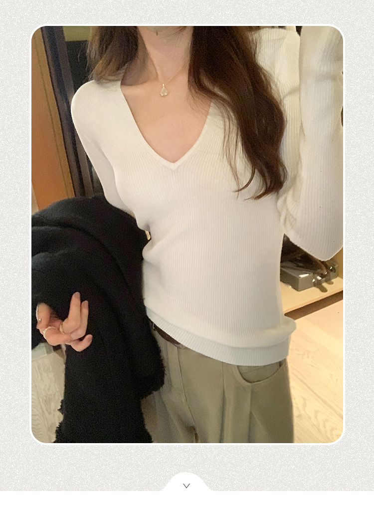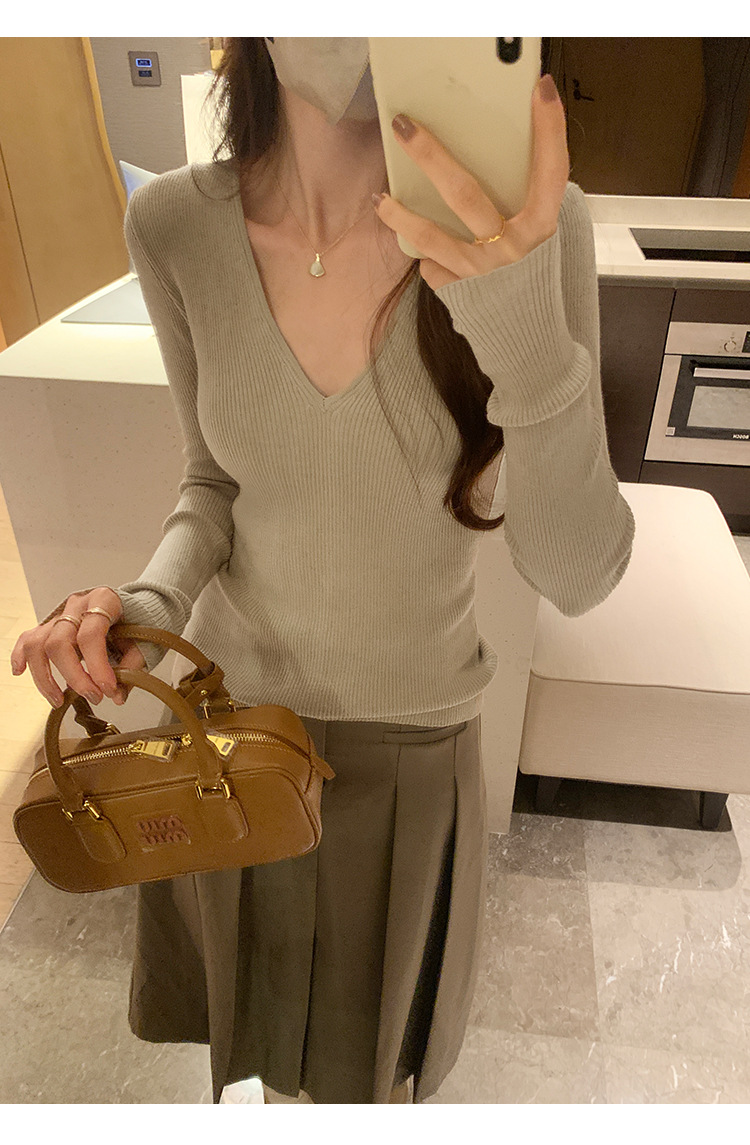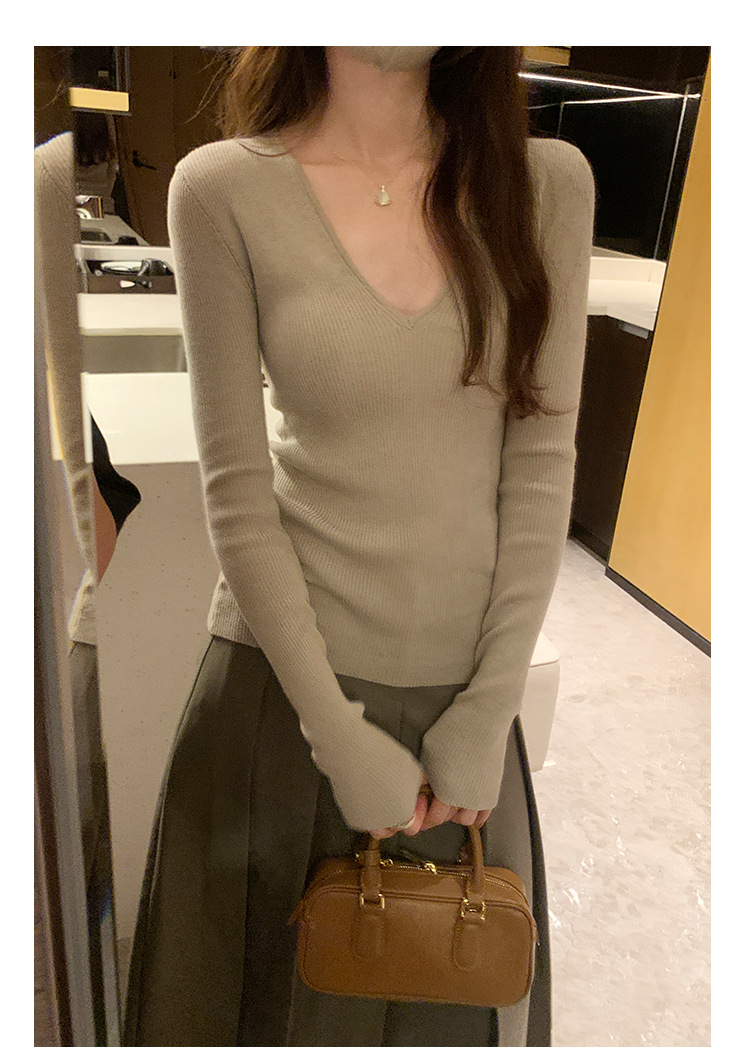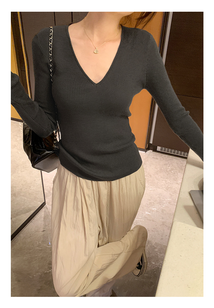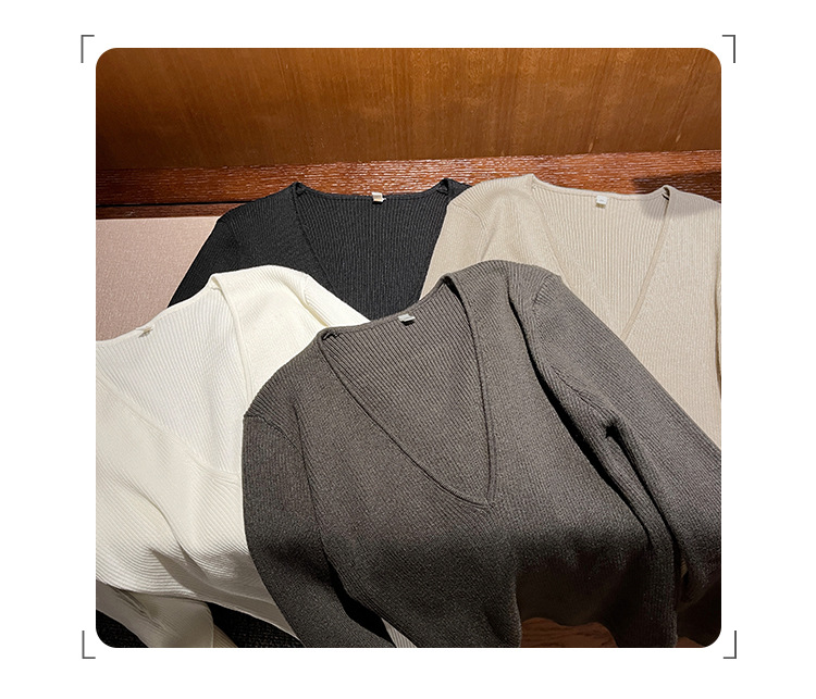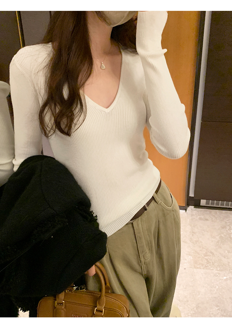 V-Neck Lazy Style Knitted Sweater for Women,Soft Long Sleeve Top, Inner Layer Basic Shirt