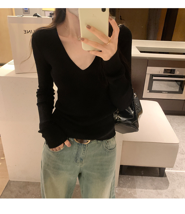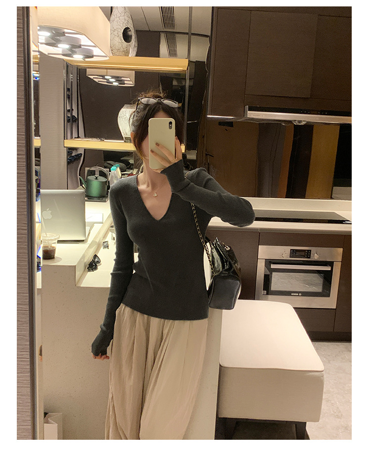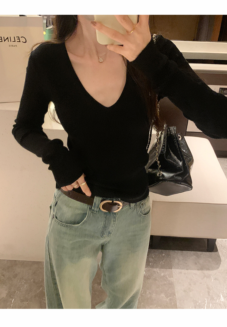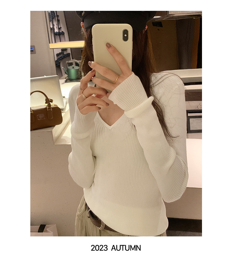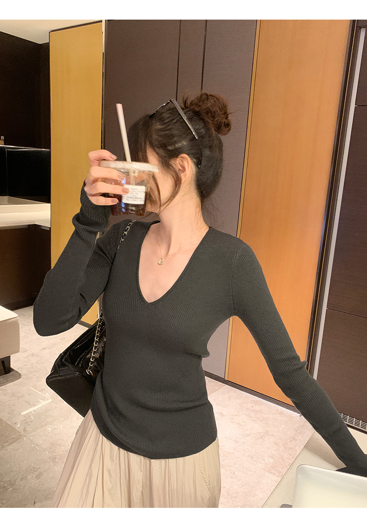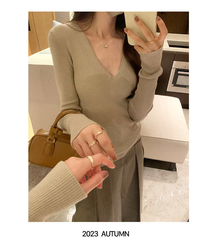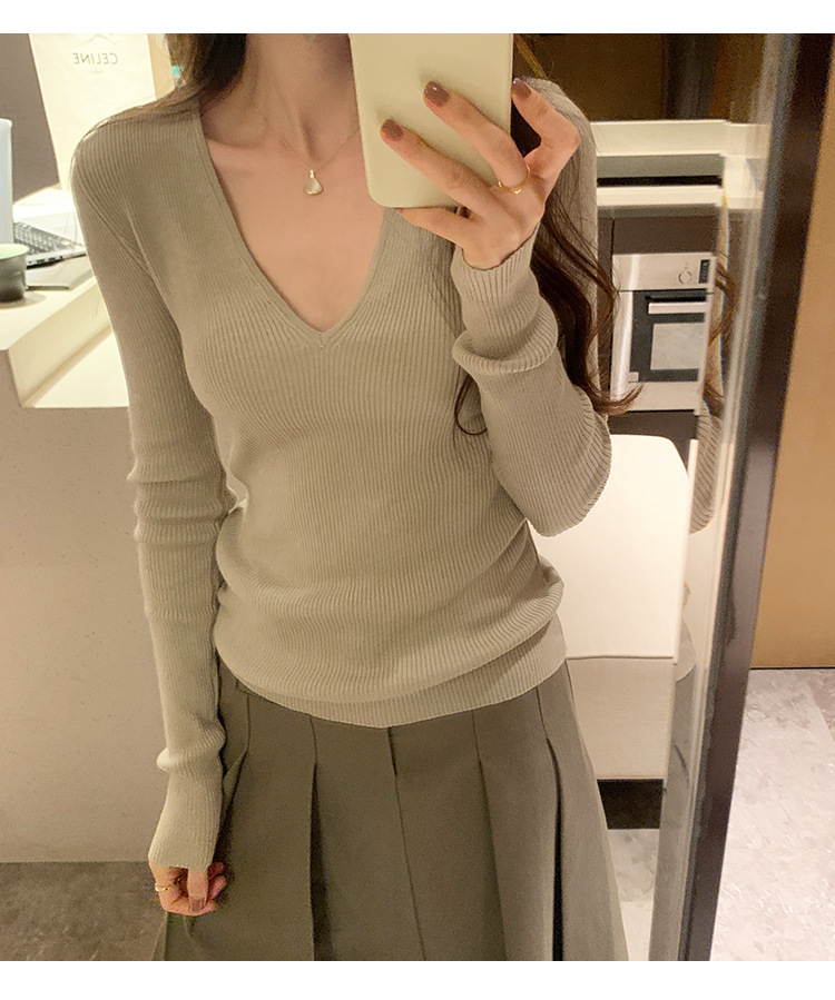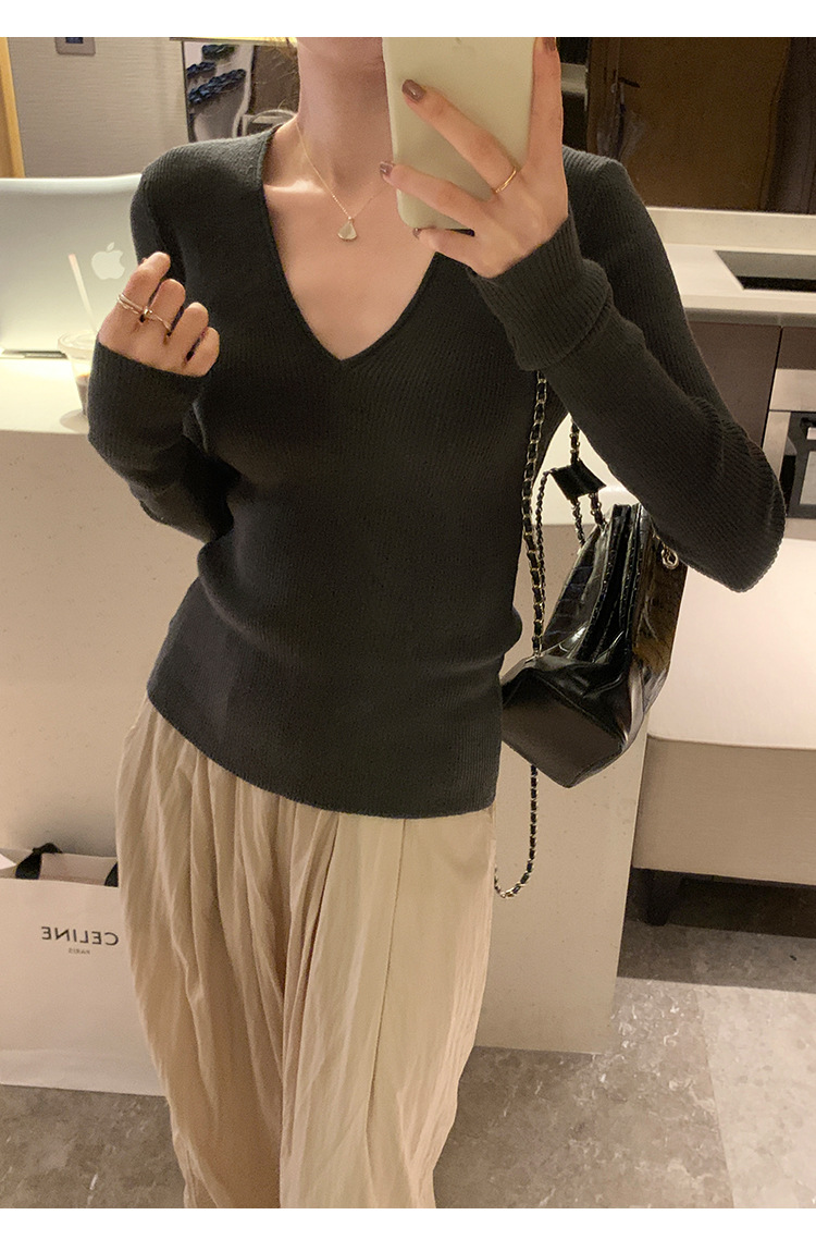 V-Neck Lazy Style Knitted Sweater for Women,Soft Long Sleeve Top, Inner Layer Basic Shirt